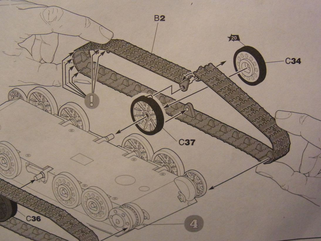 棒状のプラ履帯を曲げて真ん中の転輪で固定するという方式。可動履帯に比べりゃマシだ!