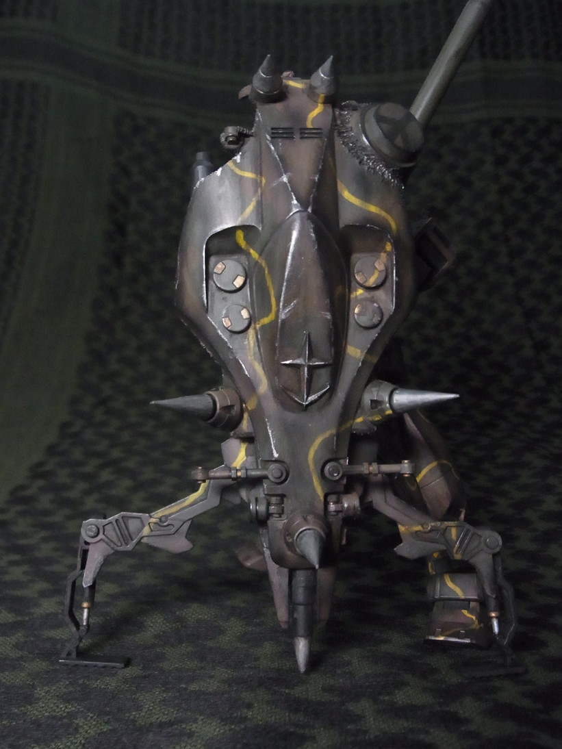 陸上自衛隊迷彩ベースに黄色いラインが首から4本伸びている。