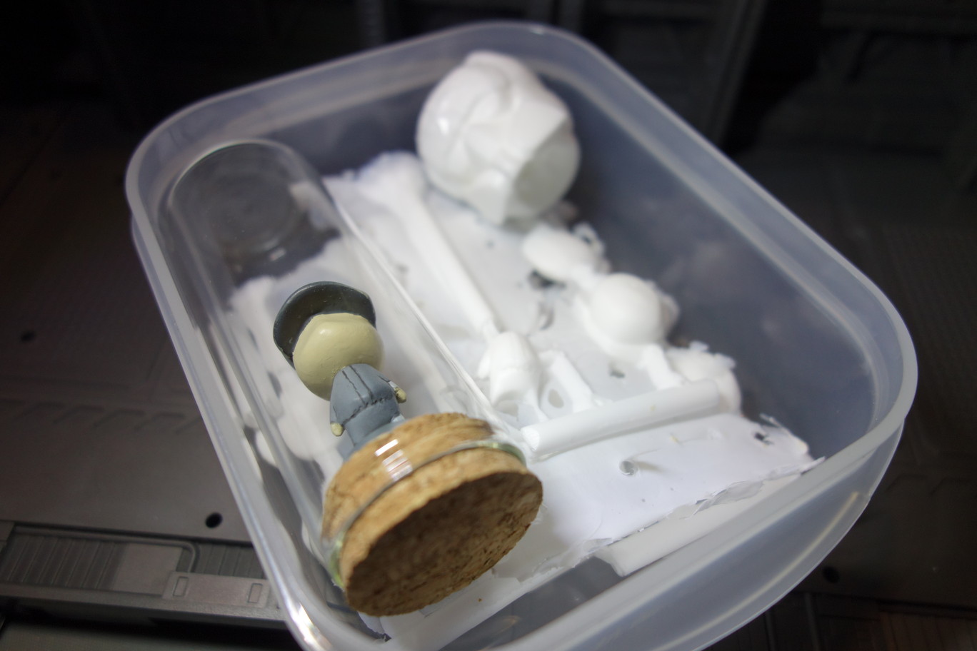 東急ハンズで手に入れたコルク栓付きの瓶に封入してエポキシ接着剤で固定!